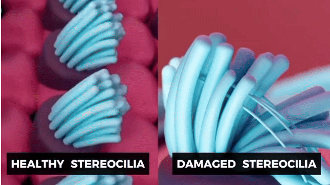 The stereocilia are responsible for converting the sound into brain signals. And over time, these tiny filaments break and become damaged.